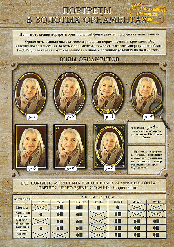 Портреты с золотым орнаментом Серию данных изделий отличает оригинальный орнамент, выполненный золотосодержащими керамическими красками, и специальный темный фон портрета. Фотографии могут быть цветные, черно-белые или сепия. |
